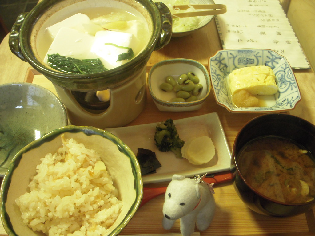 いろどり朝膳は湯豆腐をメインに油揚げ入りの筍ご飯、卵焼き。
