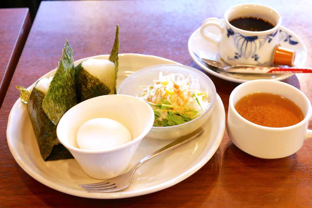 サラダ、ゆで卵、コンソメスープ。おにぎり以外はトーストに付くものと一緒みたいですね。