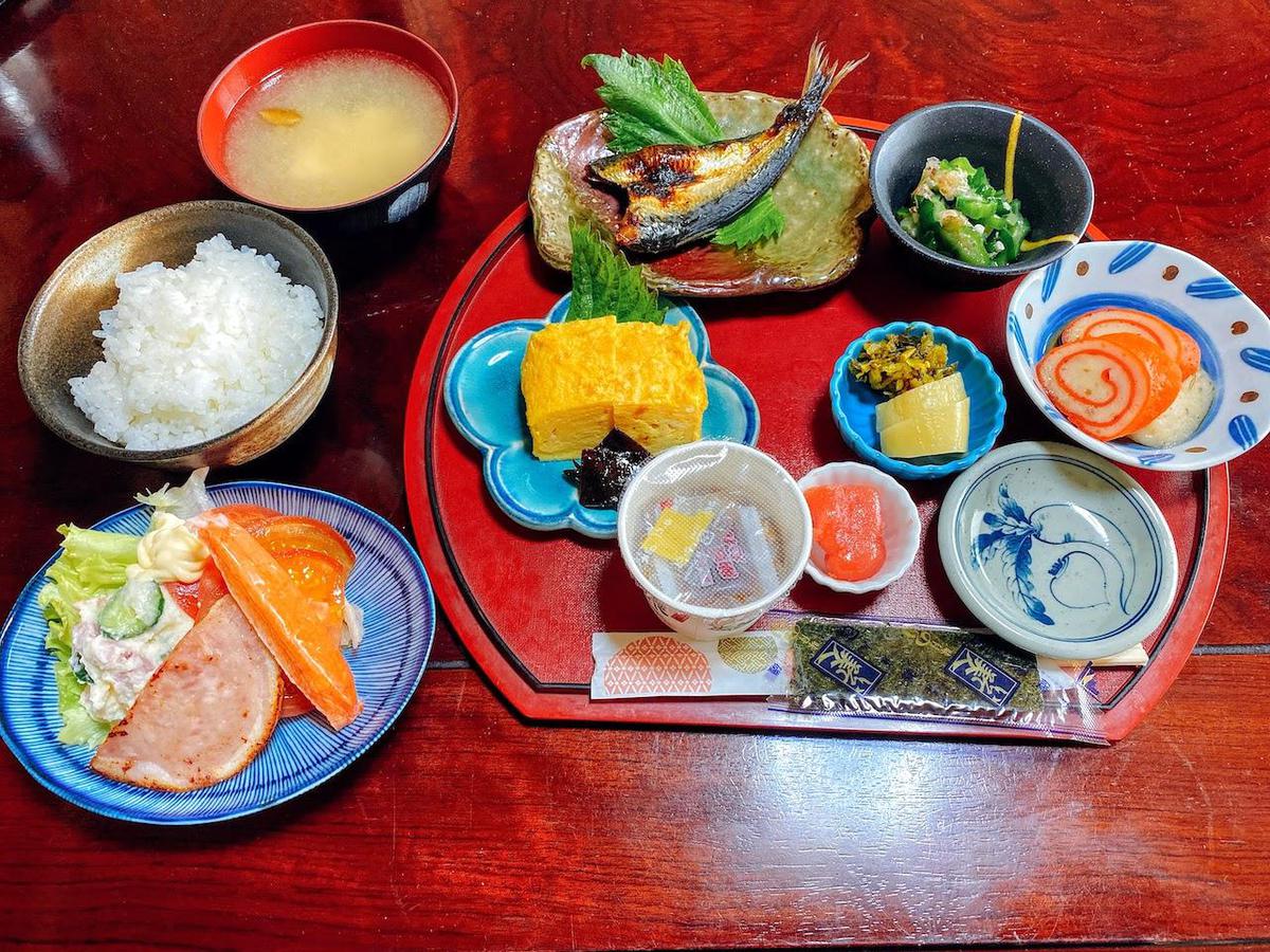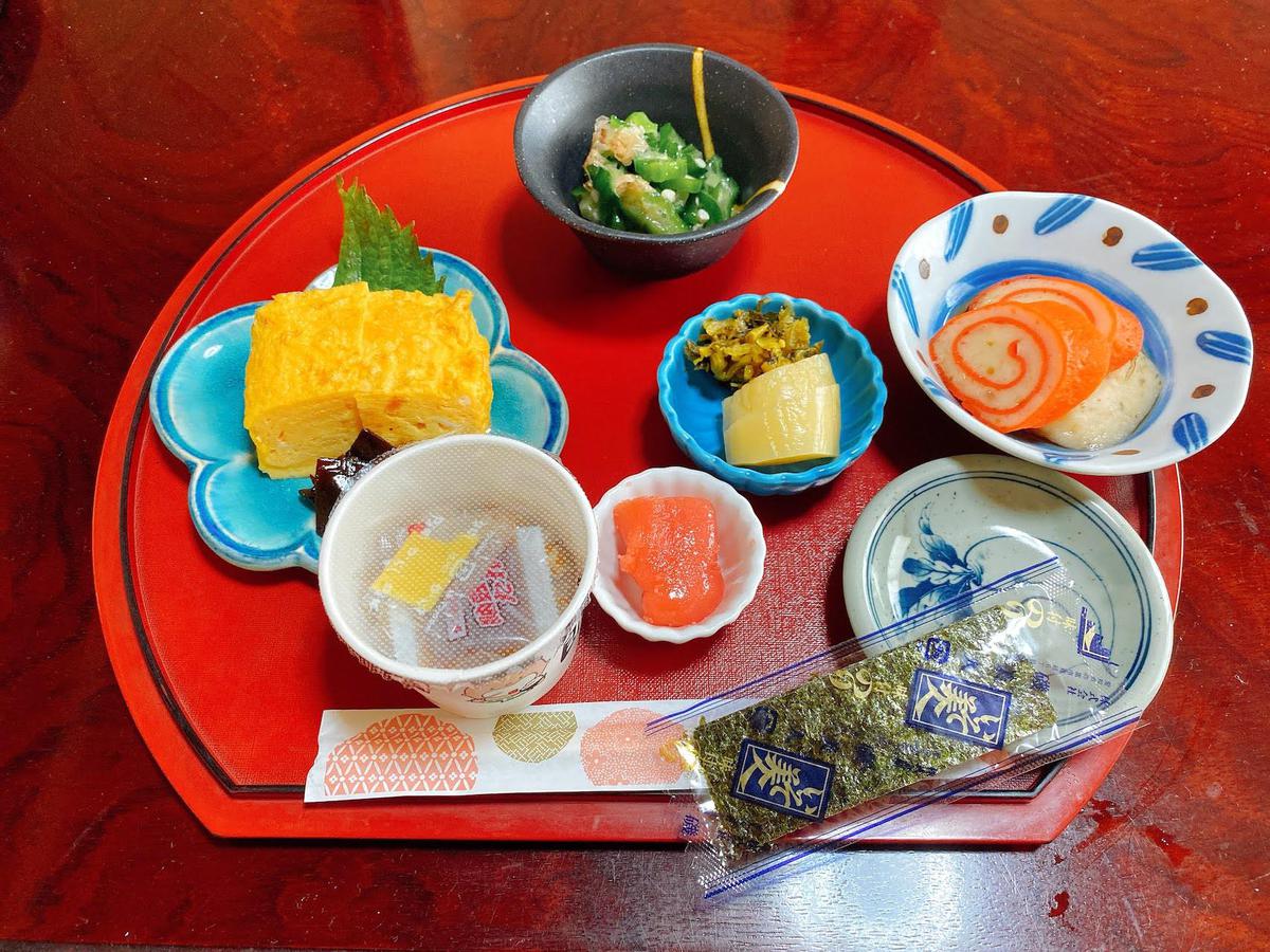 玉子焼きに納豆、味付け海苔など旅館の朝ごはんの定番。